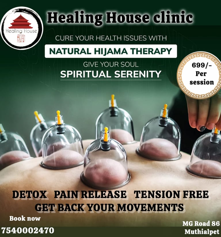 Hijama/blood cupping, also known as wet cupping, is a traditional therapeutic practice that involves placing cups on the skin to create suction, followed by making small incisions to draw out a small amount of blood. This technique is to remove toxins, improve blood circulation, and alleviate pain or inflammation. The process typically includes applying suction cups, creating light cuts, and reapplying the cups to extract blood, aiming to balance the body’s energy and promote healing.